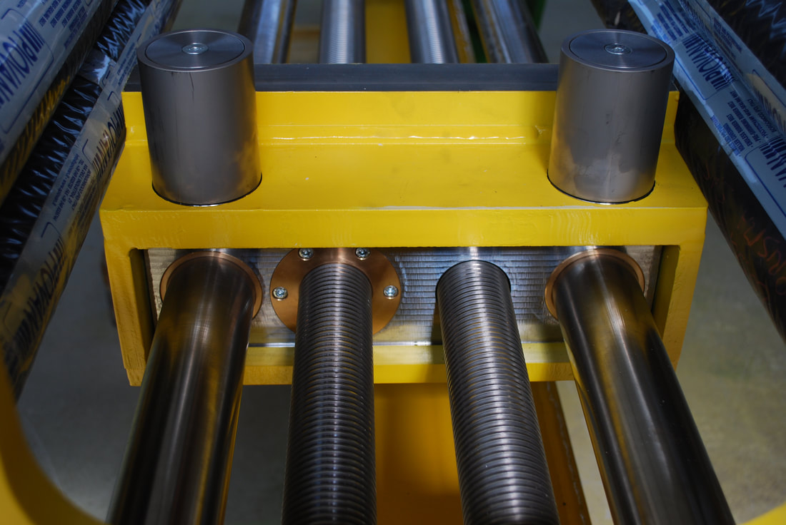 Aspo avvolgitore con gruppo espulsore e pettine separatore per coils fino a 15 tonnellate.